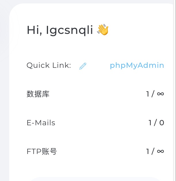 如需管理MySQL的数据库信息,面板提供后PHPmyAdmin快速链接按钮,输入Mysql账号密码即可