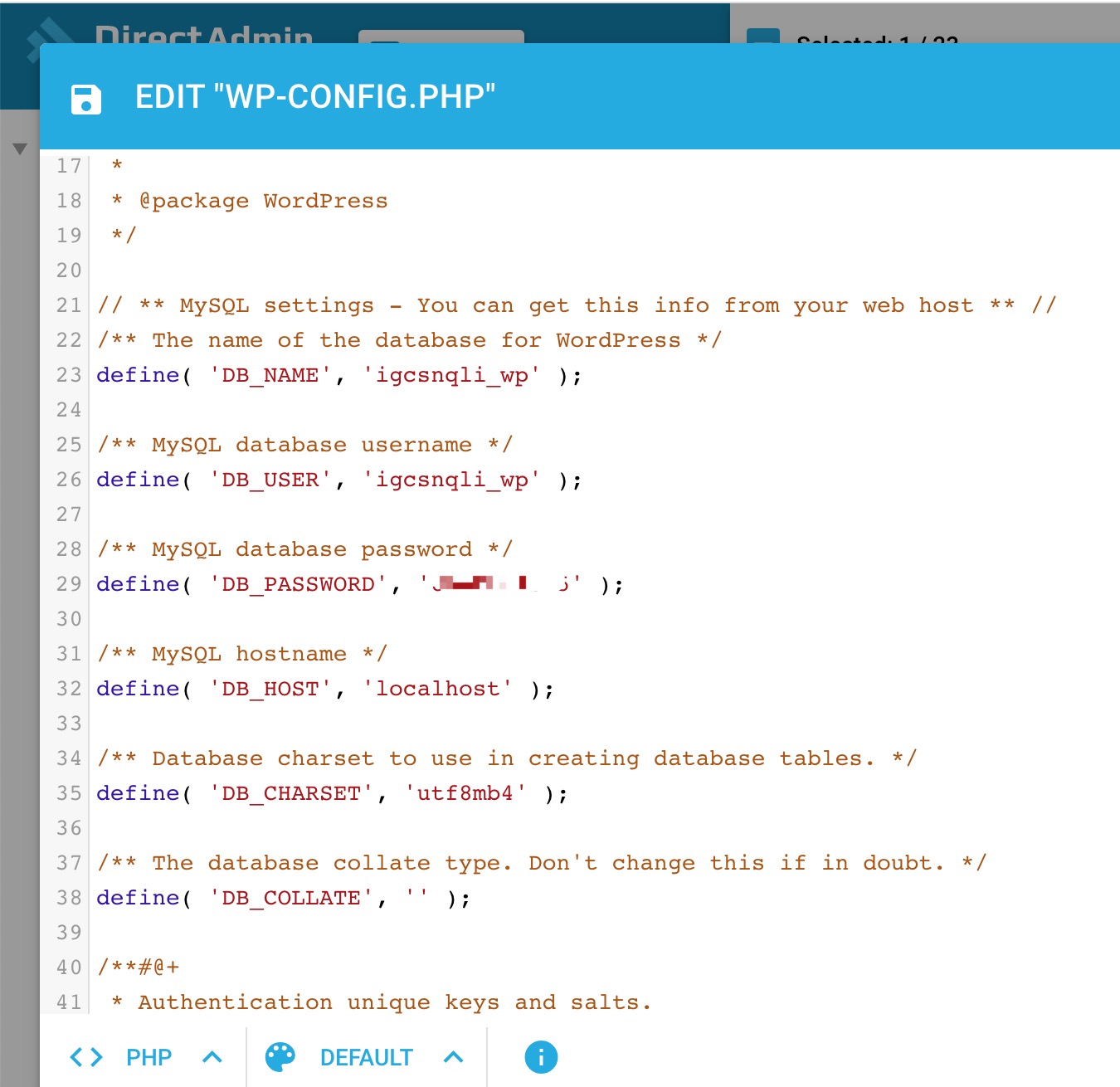以Wordpress为例,它的MySQL链接文件在 wp-config.php ,编辑查看即可